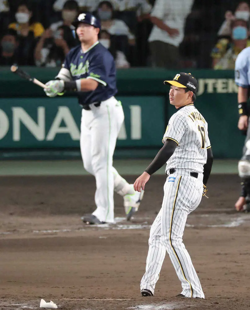 <神・ヤ>9回、村上(左)に同点ソロホームランを打たれる岩崎(撮影・椎名 航)