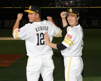 <ソ・西>和田(右)から育成時代の背番号126の数字を隠してもらい、新背番号12を披露する黒瀬(撮影・岡田 丈靖) Photo by スポニチ ソフトB・黒瀬、支配下復帰4日目で決勝犠飛&初打点「本拠地で活躍したい… ギャラリーで見る この記事のフォト 2022年08月01日の画像一覧 もっと見る 2022年08月01日の画像をもっと見る