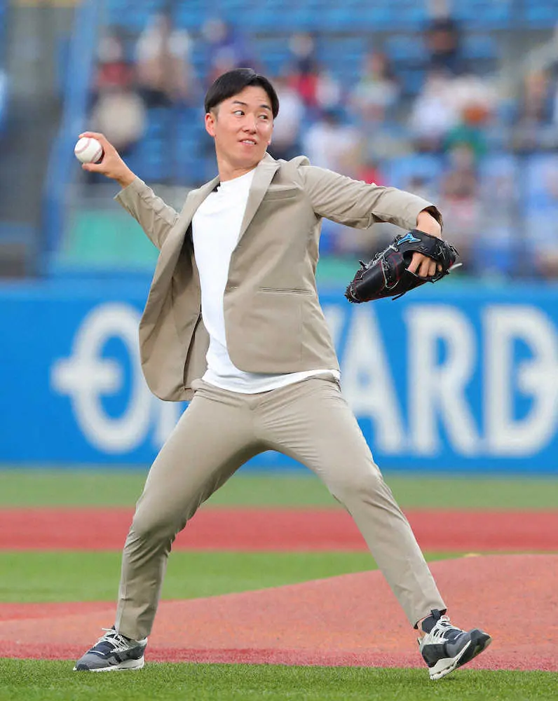 日本ハム時代の恩師のU―23NPB選抜を率いる栗山英樹監督(61)が捕手役。ベージュのジャケット姿の斎藤氏は高めに投げ込んだ。神宮のマウンドは早大のエースとして活躍した思い出の地。現役時代と同じようにさわやかな笑顔を見せて「この記念すべき試合でファーストピッチをさせて頂けるのは光栄なこと。しかも捕手が栗山さんで凄く緊張しました。投げることができて凄くうれしかった」と話した。