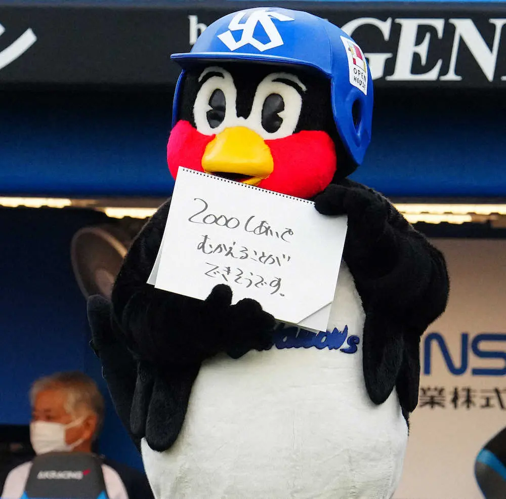 ヤクルト・つば九郎が現場復帰 新型コロナから回復、お得意のフリップ芸を披露