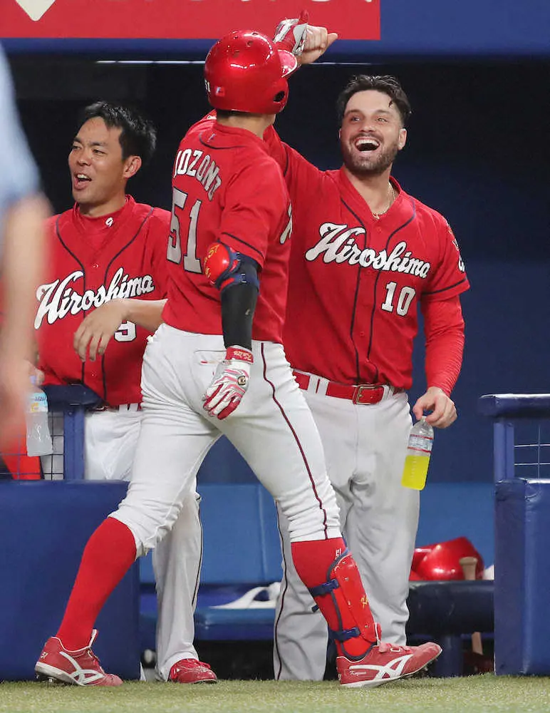 <中・広>6回、2ランホームランを放った小園(手前)を迎えるマクブルーム(右)と秋山(撮影・椎名 航)