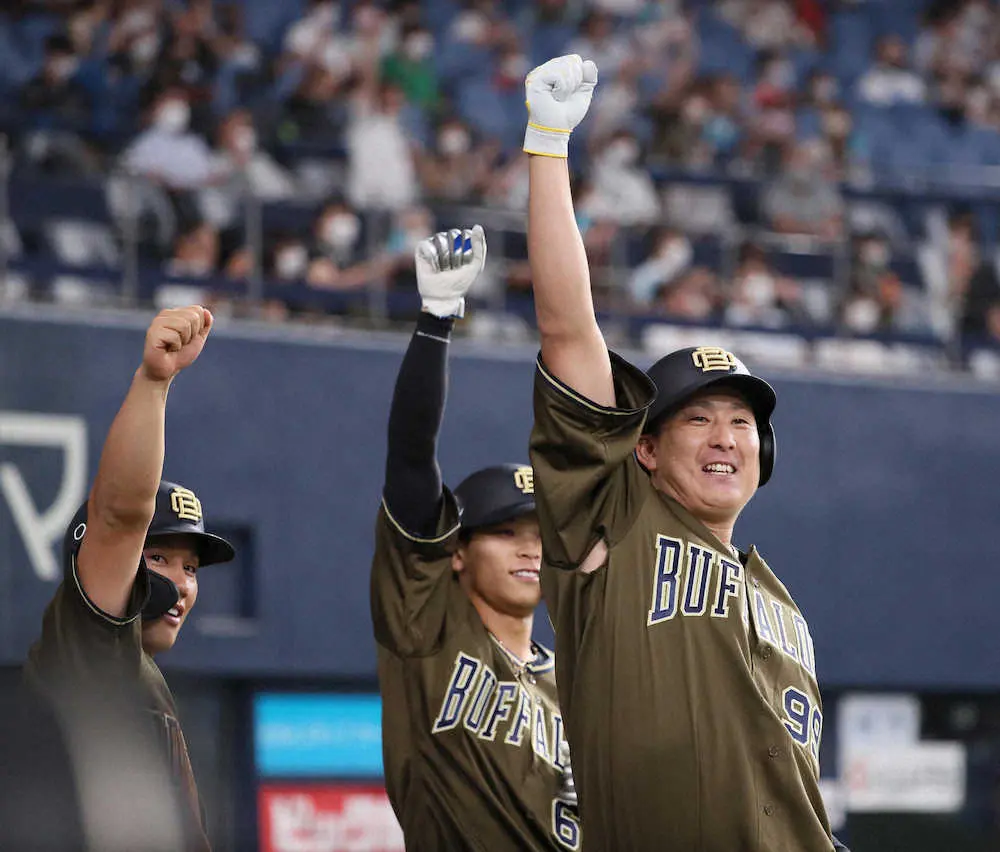 <オ・日>6回無死二、三塁、逆転の3点本塁打を放ち(左から)吉田正、中川圭と昇天ポーズを決める杉本(撮影・後藤 正志)