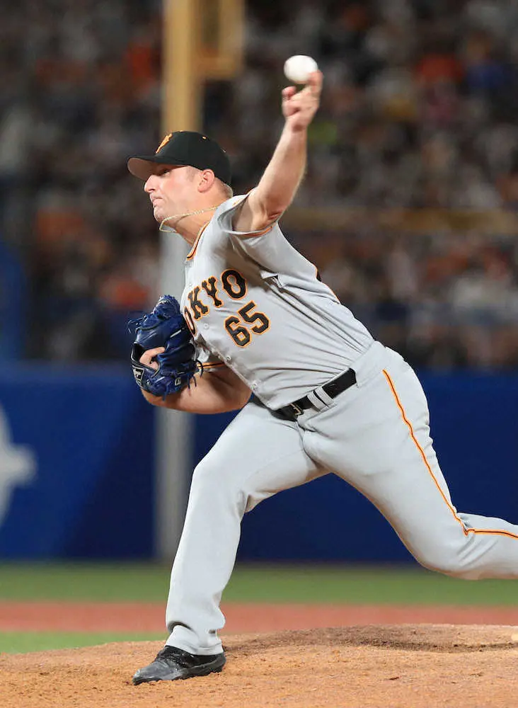 7月20日に初めて出場選手登録され、同日行われたヤクルト戦(神宮)に3番手として登板。いきなり相手主砲・村上宗隆内野手(22)に32号3ランを浴びるなどデビュー戦は不本意な結果となった。だが、その後はこれで3試合連続無失点。来日4試合目で手にした初セーブで、原辰徳監督(64)に通算1200勝をプレゼントした。また、追いつかれていれば3番手右腕・井納翔一投手(36)の687日ぶり白星が吹っ飛ぶところだったが、これを死守。大きな来日初セーブとなった。