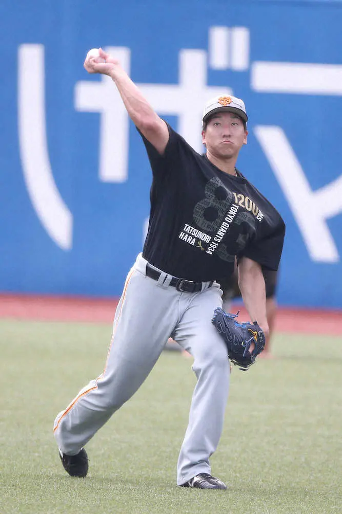 <ヤ・巨>原監督の監督通算1200勝記念シャツを着てキャッチボールする大勢(撮影・河野 光希)