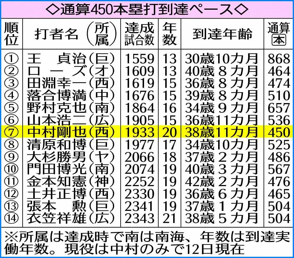 <楽・西>2回、中村が左越えにソロ本塁打を放ち通算450本塁打を達成(撮影・篠原 岳夫) Photo by スポニチ 西武・おかわり 清原超えた史上7番目の速さで450号到達!1000得点も同時… ギャラリーで見る この記事のフォト 2022年08月13日の画像一覧 もっと見る 2022年08月13日の画像をもっと見る
