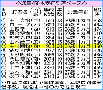 《年長記録では5位》中村(西)が12日楽天戦の2回に岸から今季8号を放ち通算450本塁打を達成した。プロ野球14人目。初本塁打は、04年7月24日の近鉄戦で山村から。38歳11カ月での達成は、10年金本知憲(神)の42歳2カ月を筆頭に史上5位の年長記録。出場1933試合目は、02年清原和博(巨)の1977試合を抜く歴代7位の到達ペースで、パのみで1~450号を放った選手では70年野村克也(南海)の1864試合に次ぐ2番目のスピード記録になった。中村が450号による得点でプロ野球45人目の通算1000得点も達成。初得点は04年3月29日のダイエー戦。通算450本塁打と1000得点の両立は史上13人目になるが同日達成は初。なお、過去12人の両方の達成日を見ると全て1000得点が先で、450号は翌年以降だった。