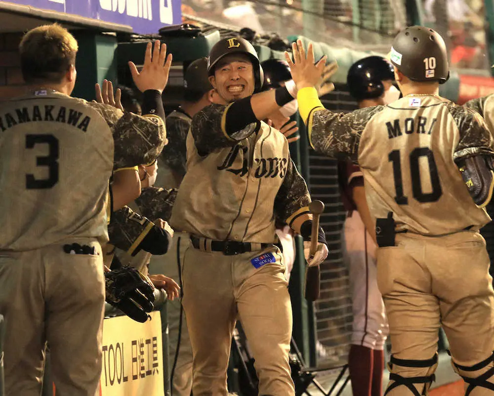 <楽・西>4回、外崎が左中間に3ランを放ち大喜びでベンチに迎えられる(撮影・篠原岳夫)
