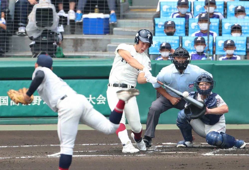 <聖望学園・大阪桐蔭>初回、大阪桐蔭・丸山は先制の右越え三塁打(撮影・井垣 忠夫)