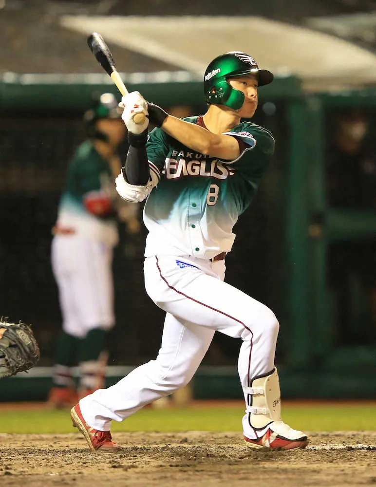 楽天・島内の一発に触発された辰己が、7回無死二塁から弾丸ライナーで右翼席最前列に飛び込む8号2ラン。値千金の同点弾に「流れが悪かったので一発を狙おうと思った。首脳陣の方も暗い顔をしていたので。負けていたらやばかった」と胸を張った。