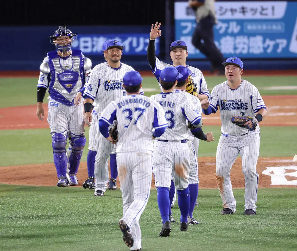 <D・巨>試合に勝利し、喜び合う佐野(中央、右)らDeNAナイン(撮影・河野 光希)