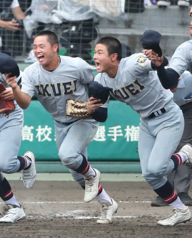 <仙台育英・下関国際>優勝を決め、歓喜してアルプス席方向に駆け出す仙台育英・斎藤蓉(右)ら(撮影・坂田 高浩)