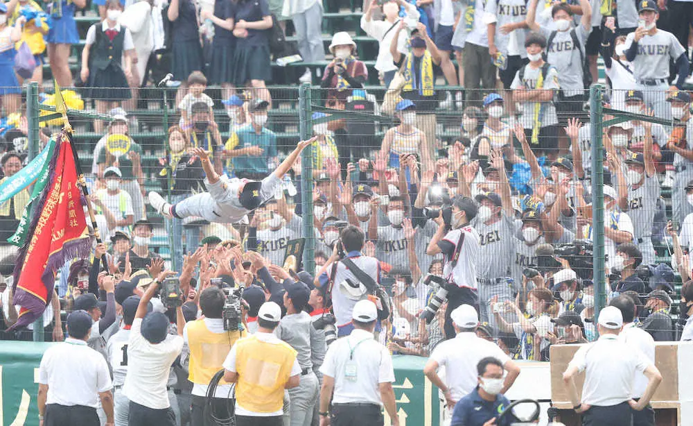 <仙台育英・下関国際>アルプス席近くで胴上げされる仙台育英・須江監督(撮影・坂田 高浩)
