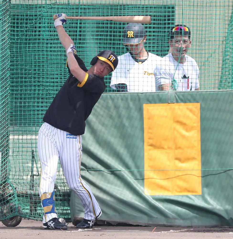 矢野監督(右)が見つめる中、打撃練習する近本 (撮影・奥 調)