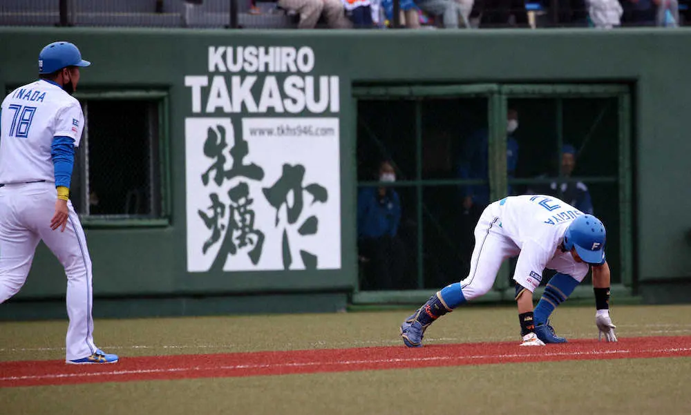 <日・オ>5回、安打を放ち三塁を回るも足がもつれる杉谷(撮影・高橋茂夫)