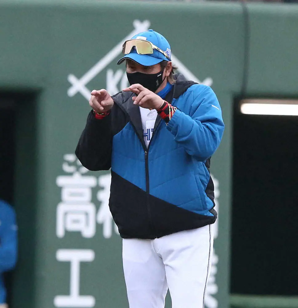 <日・オ>7回日没コールドゲームにポーズする新庄監督(撮影・高橋茂夫)