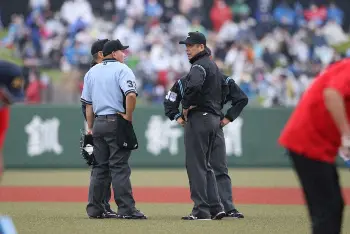 <日・オ>7回を終え、グランドに集まる審判団(撮影・高橋茂夫)