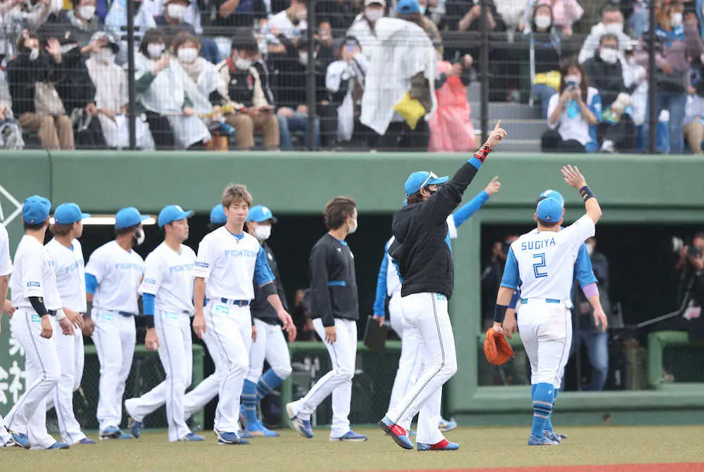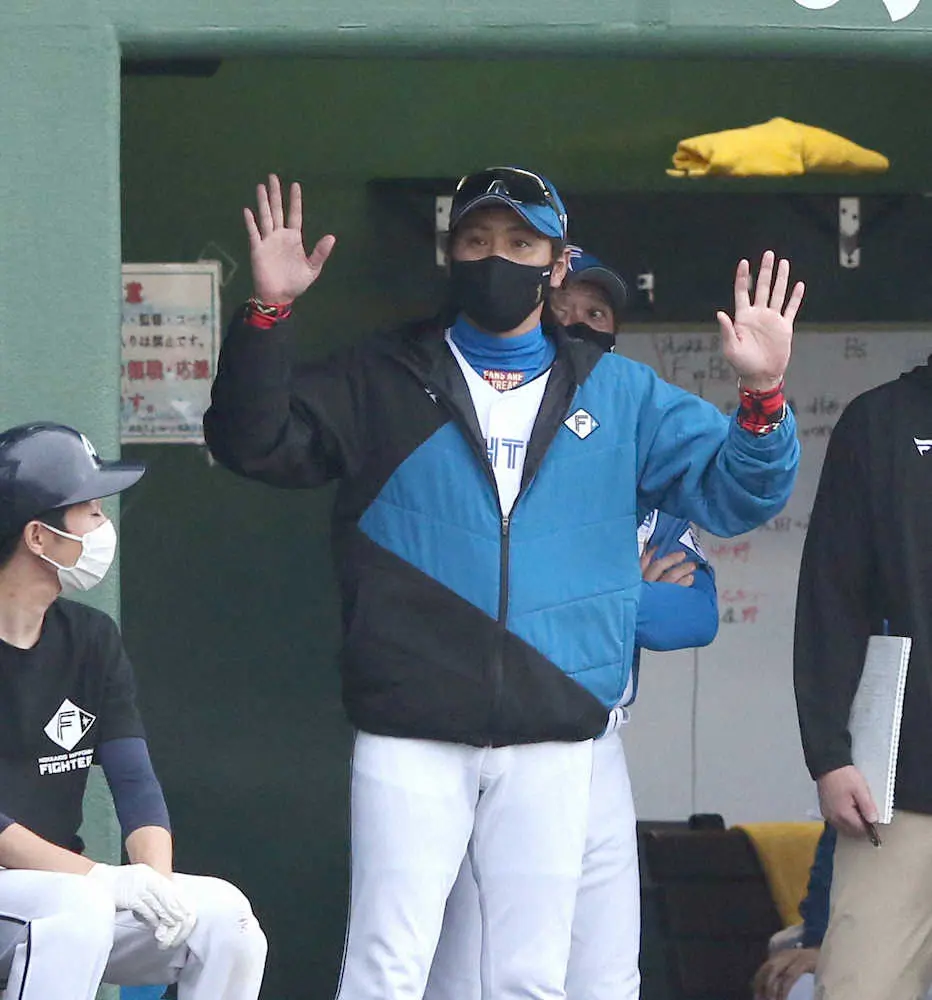 <日・オ>7回日没コールドゲームでスタンドのファンに手降る新庄監督ら(撮影・高橋茂夫)