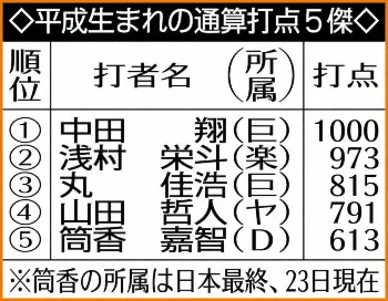 【データ】中田(巨)が23日中日戦(東京ドーム)の5回勝野から左前打を放ち通算1000打点を達成。プロ野球47人目。初打点は日本ハム時代の09年9月27日ソフトバンク戦。なお、中田は1989年(平元)4月22日生まれの33歳4カ月。1000打点の最年少は69年王貞治(巨)の29歳4カ月で、中田は58年青田昇(大洋)の33歳6カ月を抜く歴代10位。また、平成生まれで達成したのは中田が初めて。