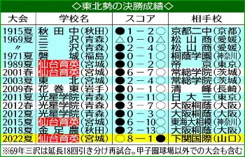東北勢の決勝成績 Photo by スポニチ 「青春って凄く密」名言誕生秘話 仙台育英・須江監督 単独インタビュー… ギャラリーで見る この記事のフォト 2022年08月26日の画像一覧 もっと見る 2022年08月26日の画像をもっと見る