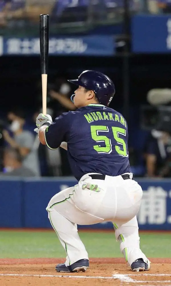 エスコバーの154キロ直球を振り抜いた打球は、右中間席中段まで運ぶ特大級の一撃。打球の行方を見極める意味もあまりないだけに、村上のしゃがみ込む動作にファンが反応。