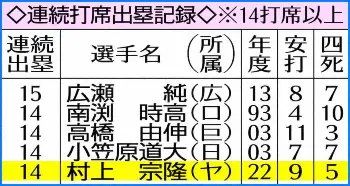 《球団新14打席連続出塁》村上の14打席連続出塁は、チームでは78年マニエルの10打席を抜く球団新。9打数連続安打は前記マニエルの10打数(10打席)連続に次ぐ球団2位の記録になった。