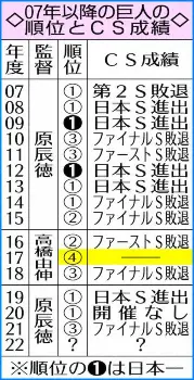 3位・阪神とは4ゲーム差の5位で、残り20試合。原監督は「我々は最後の最後まで粘り強く戦うということ」としたが、17年以来のBクラスと、原政権では初めてCSを逃す崖っ縁となった。(川島 毅洋)