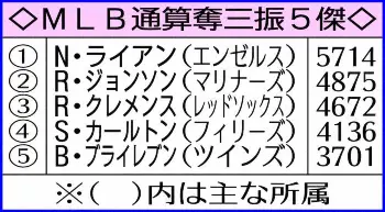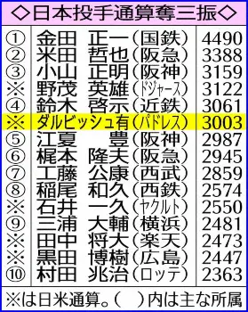 《日米通算3003奪三振は日本選手では6位相当》ダルビッシュの日米通算3003奪三振は、日米通算も含めた日本選手では6位相当。NPB最多は金田正一の4490奪三振で、大リーグトップはノーラン・ライアンの5714奪三振。また、3000奪三振に通算2721回2/3での到達は、野茂英雄の2834回1/3より速い。大リーグでの通算1753奪三振は現役では12位で、トップはシャーザー(メッツ)の3168奪三振。なおダルビッシュは日米通算で101試合(日本52、米国49)の2桁奪三振をマークしており、こちらは野茂と並んでいる。NPB最多は金田正一の103試合。