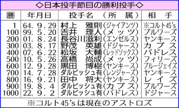 プレーオフ争いの中で負けられない状況で、同地区首位で30球団最高の勝率・687を誇る強打線に、三塁を踏ませない安定感で7回無失点。4年連続で規定投球回に達した。さらにこの日の白星は、日本投手による大リーグ通算1000勝目となった。1964年9月29日、村上雅則が救援登板で挙げた初勝利から58年。「勝つって本当に難しい。試合に投げることですら難しい。その中で1000個目の勝ち。一回一回に自分は苦しさや大変さは分かっているので。過去の日本の選手たちにも感謝したい」