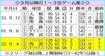 パ・リーグ、上位3チームが0差にひしめく大混戦 9月以降では21年ぶり