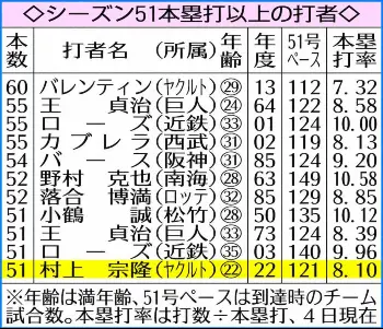 《日本人は落合以来》村上のシーズン51本塁打以上は、13年バレンティン(ヤ=60本)以来9人目(11度目)。日本人では85年落合博満(ロ=52本)以来37年ぶり。チーム121試合目での51号は、前記バレンティン(112試合)、02年カブレラ(西=119試合)に次ぐ3番目のスピードで最終60本ペース。また、中日戦はカード別最多の13本(次いで広島戦12本)。本塁打率(打数÷本塁打)も5・77でカード別トップ。