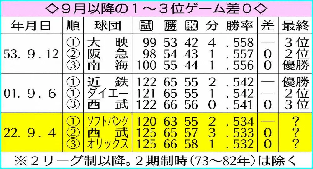パ・リーグは1~3位がゲーム差0。2リーグ制後、9月以降に上位3チームがゲーム差0は01年9月6日のパで同率首位の近鉄、ダイエー、3位西武とひしめいて以来21年ぶり3度目(2期制時のパは除く)。前回は近鉄がその後14試合を11勝3敗と猛チャージを見せリーグ優勝した。