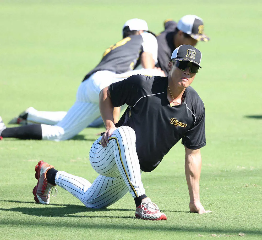 鳴尾浜での練習に参加し、ストレッチをする糸井(撮影・後藤 正志)