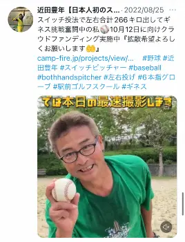 日本プロ野球初のスイッチピッチャーとして知られる、元阪神タイガースの近田豊年氏(56)がスイッチ投法で左右合計266kmギネスに挑戦することが分かった。