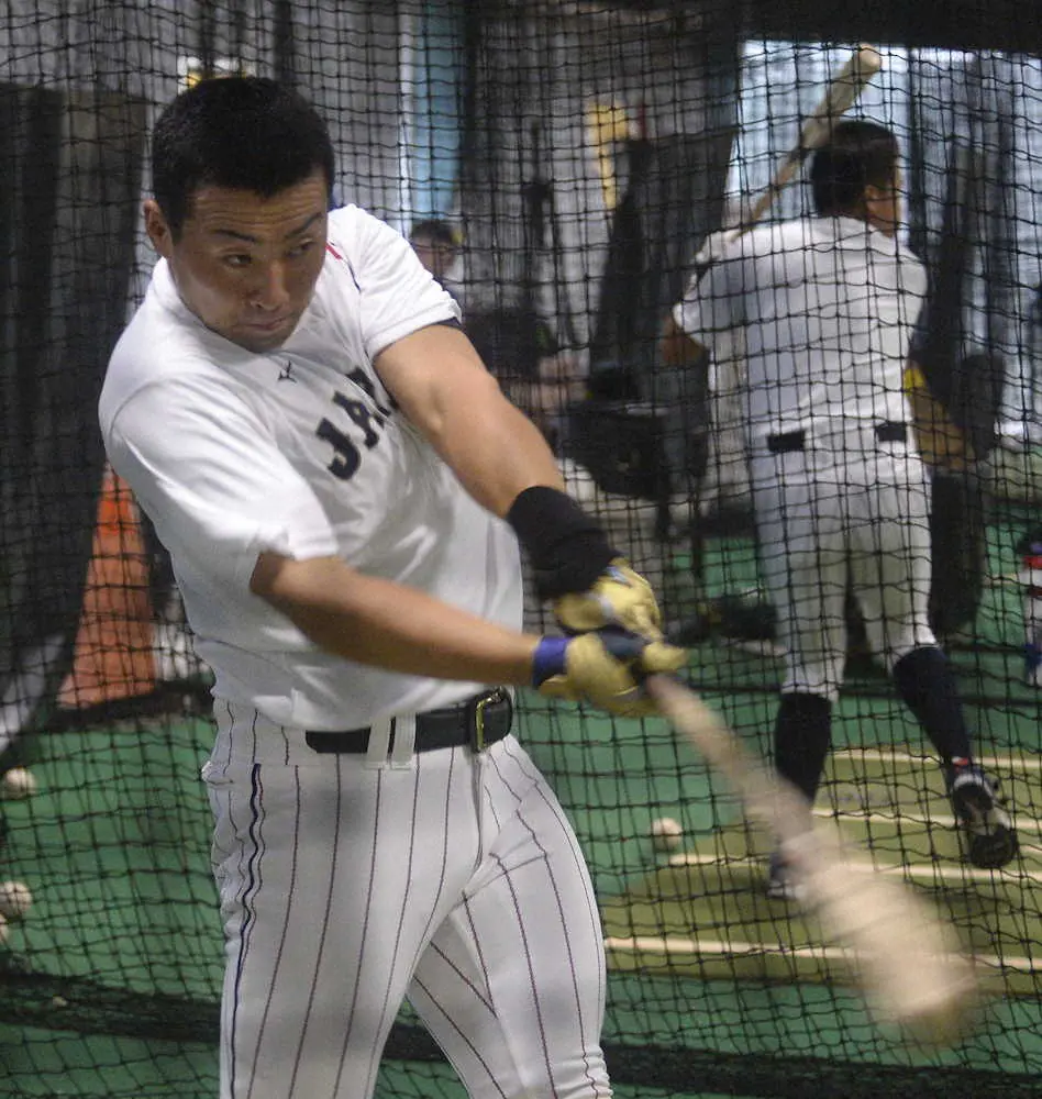 室内で打撃練習をする浅野