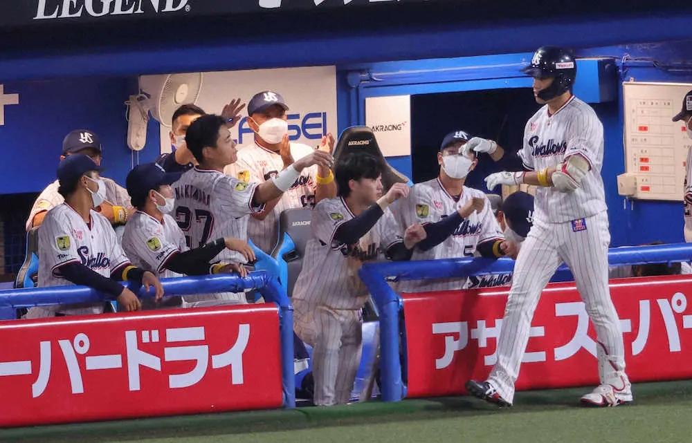 <ヤ・巨>7回、ソロを放ちナインに迎えられる塩見(右)(撮影・光山 貴大)