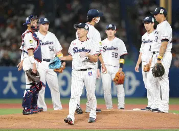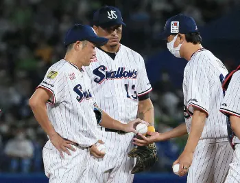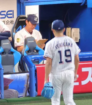 <ヤ・巨>5回、丸に適時二塁打を浴びたところで降板となった石川(右)の奥でうつむく高津監督(撮影・光山 貴大)