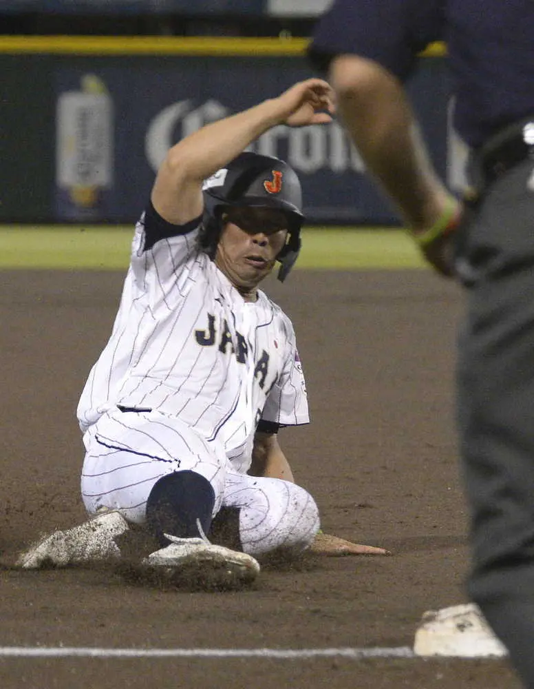 <日本・オーストラリア>初回無死一塁、黒田義信の犠打で三塁を陥れる浅野翔吾。この後悪送球で生還