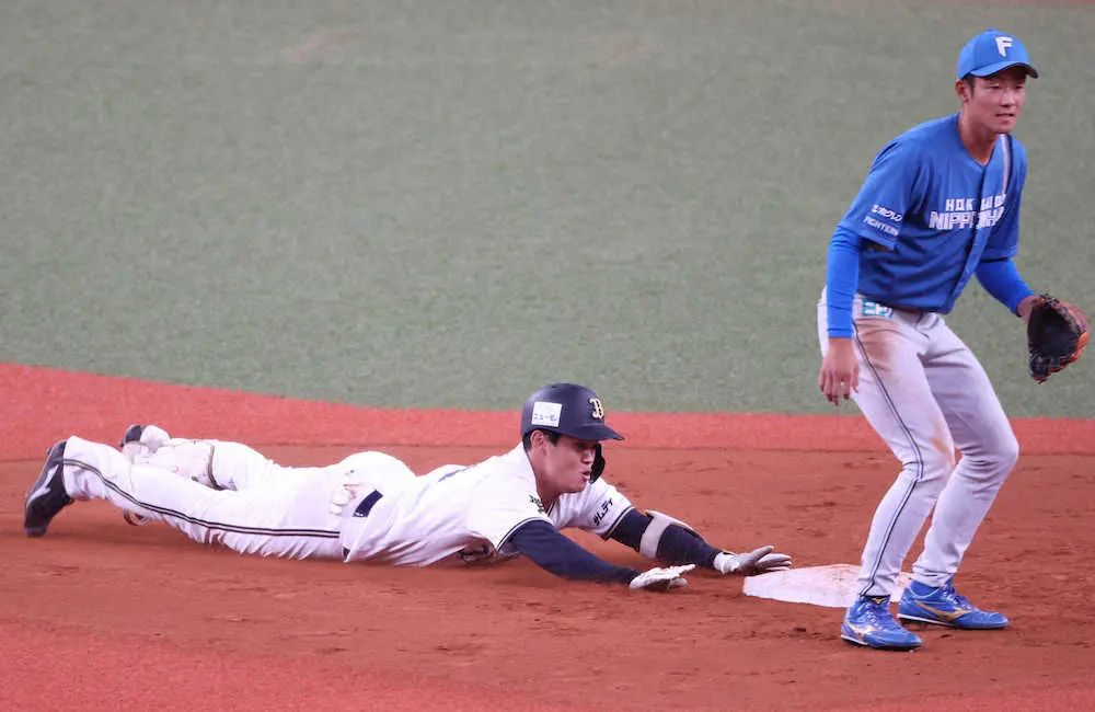 <オ・日>12回無死、左中間二塁打を放ち、二塁にヘッドスライディングを決める太田(撮影・北條 貴史)