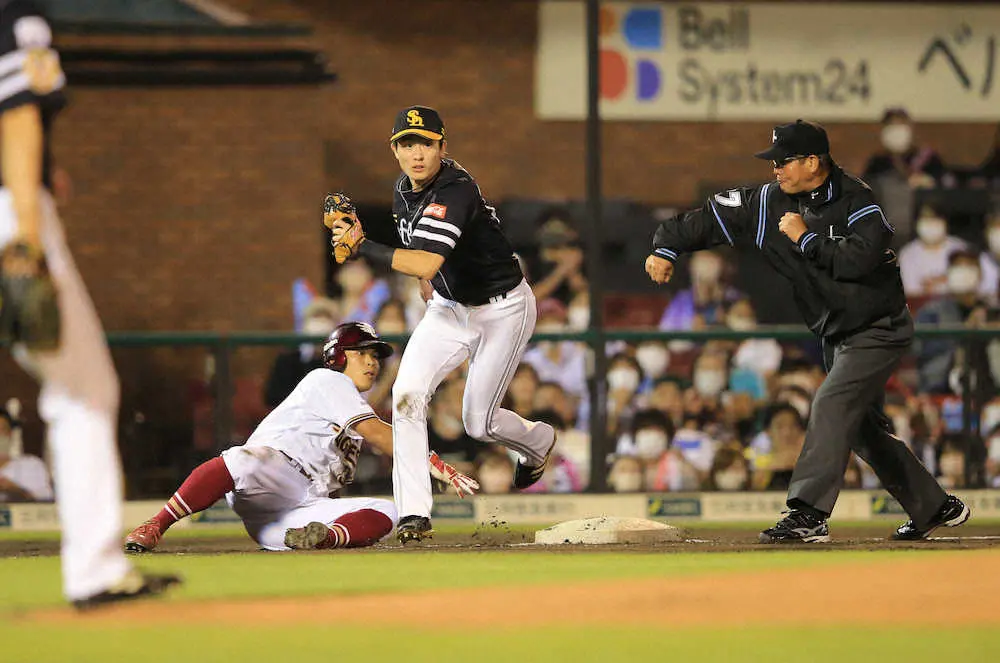 <楽・ソ>初回無死三塁、鈴木大の投ゴロで三塁走者の山崎がタッチアウトかと思われたがボールが周東のグラブからこぼれる。周東は急いでボールを拾うが山崎はベースを離れ、周東が改めてタッチしてアウトに(撮影・篠原岳夫)