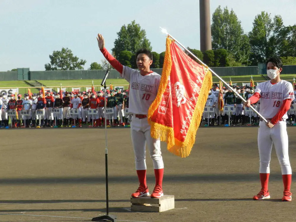 選手宣誓をする佐賀銀行の西田侑矢主将