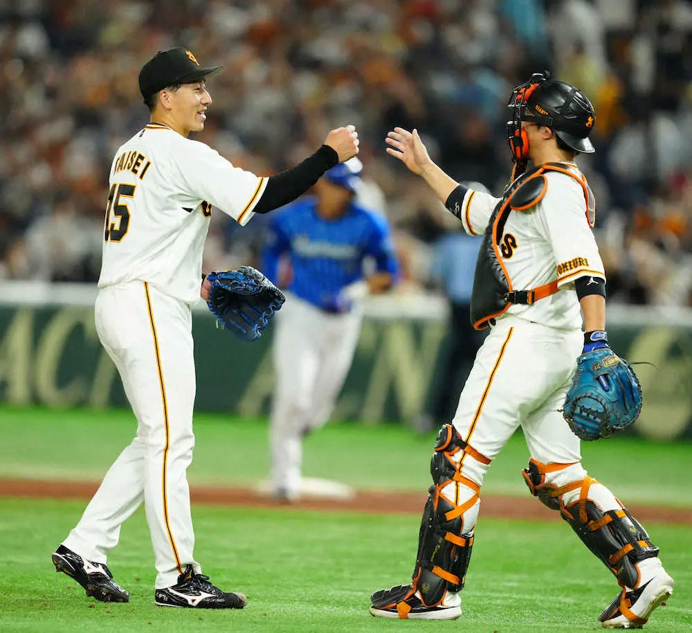 オール直球勝負の4球目を打たれた大勢は打球を振り返りながら“しまった!”という表情。だが、その後は即座に気持ちを切り替えて牧を156キロ直球で、宮崎をフォークボールで2者連続の空振り三振。最後はソトを152キロ直球で二飛に打ち取ってゲームセットにこぎつけると、ホッとしたように笑みをこぼした。大勢はこれで今季34セーブ目。2015年山崎康晃(DeNA)、22年栗林良吏(広島)がマークした新人最多37セーブまで残り8戦で「あと3」と迫った。