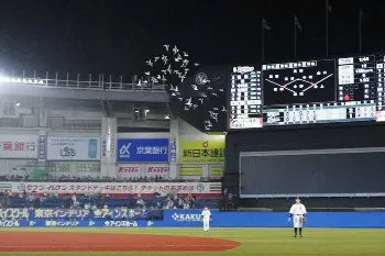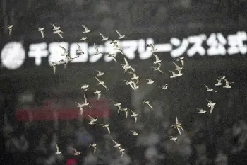 ZOZOマリンに鳥の大群襲来で試合中断 照明消すもなかなか球場を後にせず… 角中が撃退?