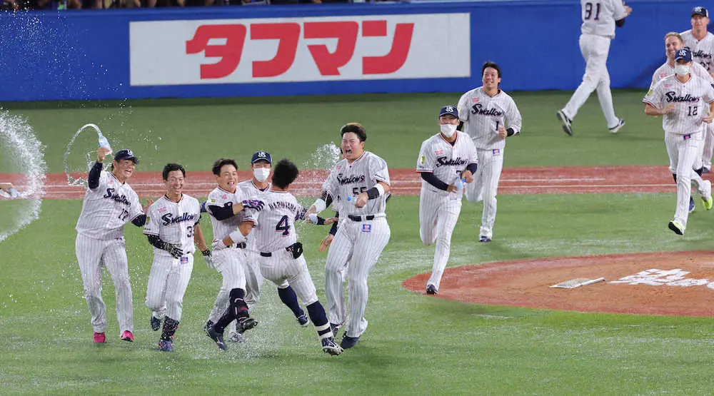 <ヤ・D>サヨナラで優勝を決め歓喜の村上(右)らヤクルトナイン(撮影・会津 智海) Photo by スポニチ ヤクルトが劇的サヨナラ勝ちでリーグ2連覇 ドラ2の丸山和が決めた 新人… ギャラリーで見る この記事のフォト 2022年09月25日の画像一覧 もっと見る 2022年09月25日の画像をもっと見る
