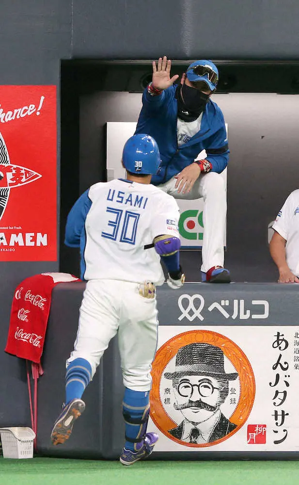 <日・楽25>3回、先制ソロを放った宇佐見を迎える新庄監督(撮影・高橋茂夫)