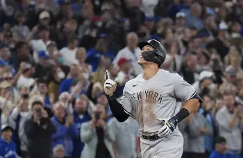 この日ここまで無安打だったジャッジは、3―3で迎えた7回の第4打席、1死一塁の場面でフルカウントからの8球目を強振。白球は快音を残し、左翼席へと美しい放物線を描く勝ち越し2ランとなった。20日(同21日)のパイレーツ戦で60号を放って以来、8試合ぶりの一発。大歓声の中、ダイヤモンドを一周、生還後に前打者アーロン・ヒックスとハグ、一塁側ベンチの前では出迎えたナインの一人一人とハグをして快挙を喜んだ。敵地のブルージェイズファンも総立ちでメモリアルアーチを祝福した。