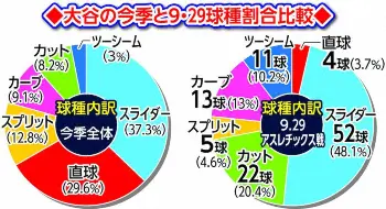 2日前、同僚左腕スアレスから「テレビゲームで翔平を中継ぎで登板させ、スライダーを多投させて打たれまくった」と“難癖”を付けられた。だが、現実では1分間あたりの回転数が昨年まで平均2300台から、今季は平均2491に上昇。より鋭くなったスライダーを軸に、今季リーグトップの10度目の2桁10三振を奪った。