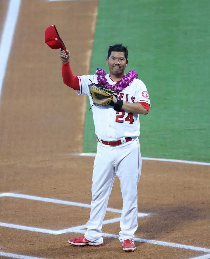 今季限りでの現役引退を表明しているエンゼルスのカート・スズキ捕手(38)の引退セレモニーが30日(日本時間10月1日)、本拠地レンジャーズ戦前に行われた。