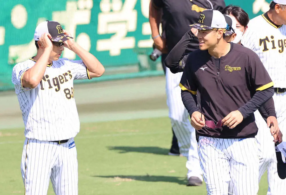 <阪神練習>矢野監督(左)にあいさつする佐藤輝(撮影・北條 貴史)