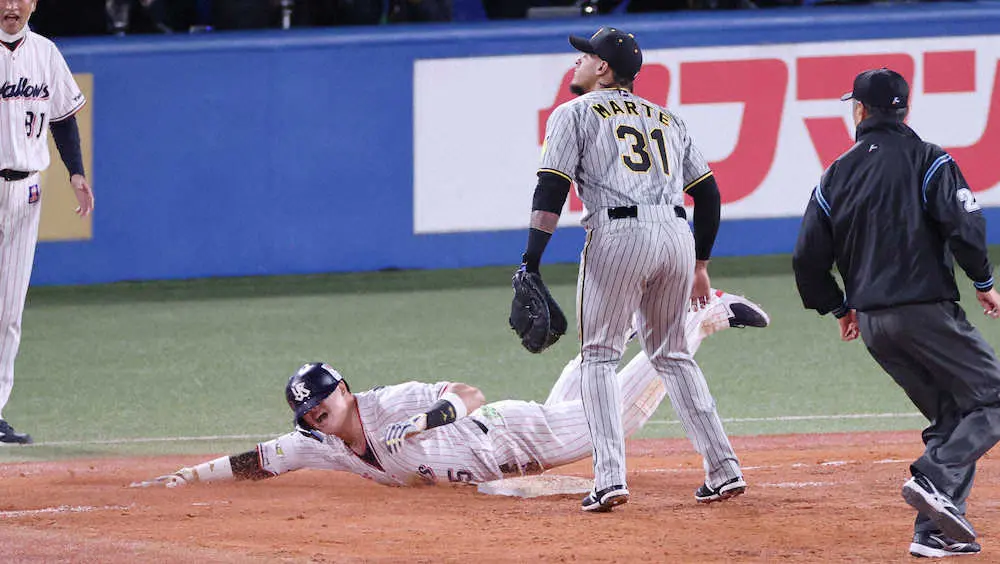 7回、村上の投ゴロを浜地が一塁へ悪送球、満塁の走者一掃の逆転打となり苦笑い(撮影・村上 大輔) Photo by スポニチ ヤクルト・村上 逆転呼ぶ激走&ヘッスラがトレンド入り!「気迫が違う」… ギャラリーで見る この記事のフォト 2022年10月14日の画像一覧 もっと見る 2022年10月14日の画像をもっと見る