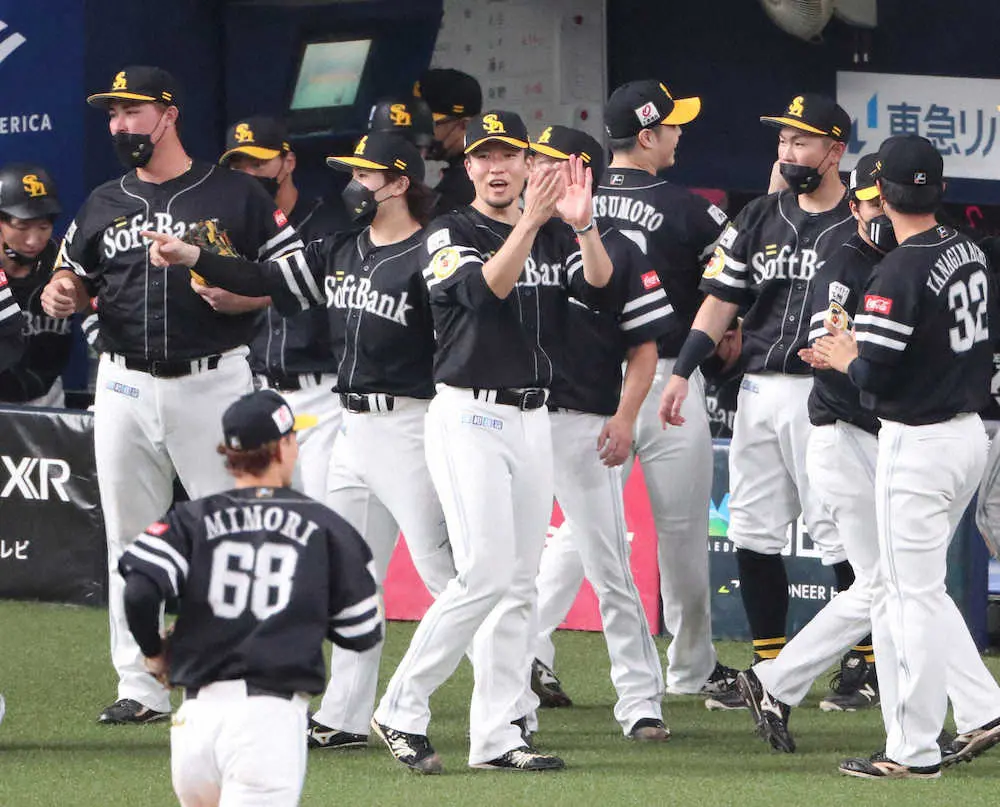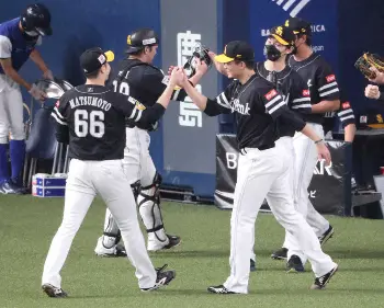 この回を嘉弥真と松本の継投で1死二、三塁のピンチを無失点に抑えると、千賀を含むベンチはガッツポーズで守備陣を出迎えた。8回は藤井、9回はモイネロが1死一、二塁のピンチを招くも6番・杉本を併殺に打ち取りチーム一丸で1勝をつかみ取った。